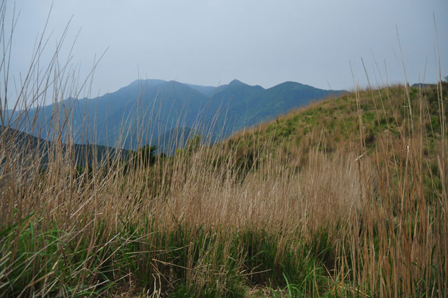 ススキ原の中にポツポツと紅花山芍薬の葉っぱ