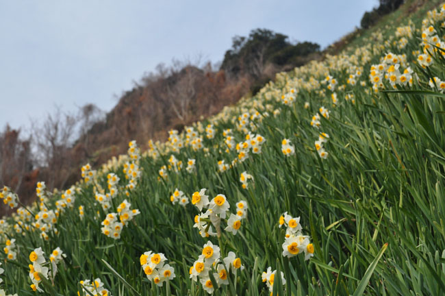 事前に水仙の開花状況や天気予報を調べて、この日がベストと思って行ったのですが、なんだか空はパッとしない曇り空…